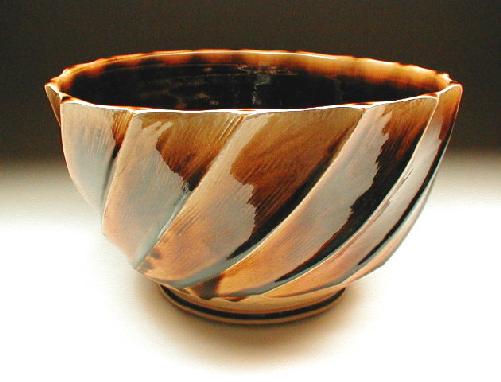 Spiral Carved Bowl wood fired salt glaze porcelain cone 10 with Temoku glaze .